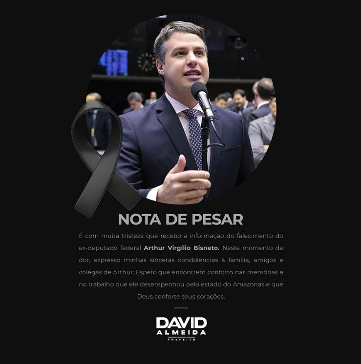 O prefeito de Manaus, David Almeida, manifestou sua solidariedade em suas redes sociais, expressando suas sinceras condolências à família, amigos e colegas de Arthur Bisneto. Almeida desejou que todos encontrem conforto nas memórias e no trabalho que Bisneto desempenhou pelo estado do Amazonas, e anunciou luto oficial de três dias pela morte do ex-secretário Chefe da Casa Civil do município. “É com muita tristeza que recebo a informação do falecimento do ex-deputado federal Arthur Virgílio Bisneto. Neste momento de dor, expresso minhas sinceras condolências à família, amigos e colegas de Arthur. Espero que encontrem conforto nas memórias e no trabalho que ele desempenhou pelo estado do Amazonas e que Deus conforte seus corações,” pontuou o prefeito.
