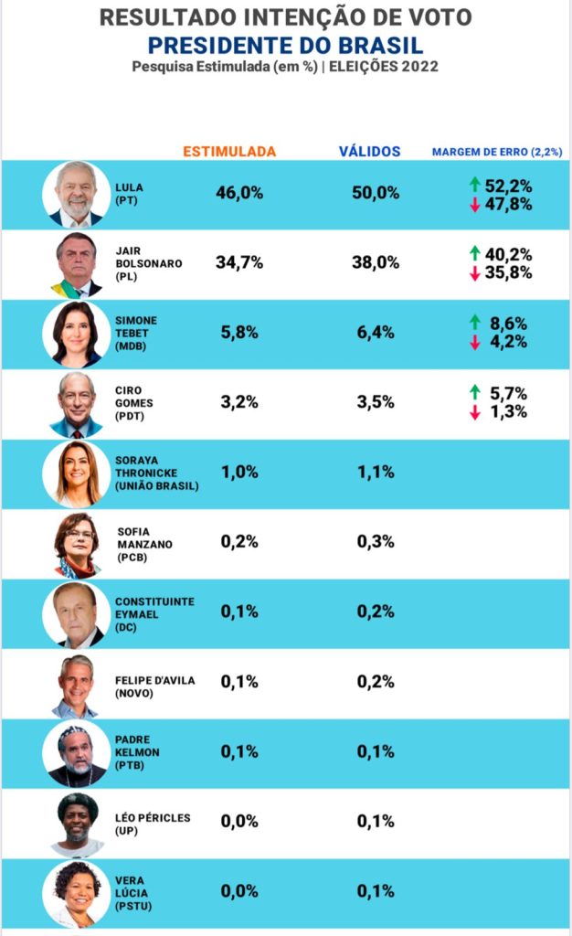 Excluindo os votos brancos e nulos, o ex-presidente Lula aparece com 50% dos votos válidos, à frente do presidente Jair Bolsonaro, que chega a 38%. A senadora Simone Tebet pontuaria 6,4% e o ex-ministro Ciro Gomes, 3,5%.