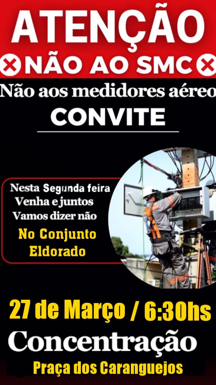 Grupos de manifestantes estão espalhando um convite para um protesto contra a instalação do Sistema de Medição Centralizada (SMC), os medidores aéreos, no conjunto Eldorado, localizado no bairro Parque Dez de Novembro, zona Centro-Sul de Manaus. A manifestação está marcada para a próxima segunda-feira (27/3), data em que a Câmara Municipal de Manaus (CMM) pode aprovar de forma definitiva o projeto que proíbe a instalação dos medidores pela Amazonas Energia.