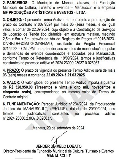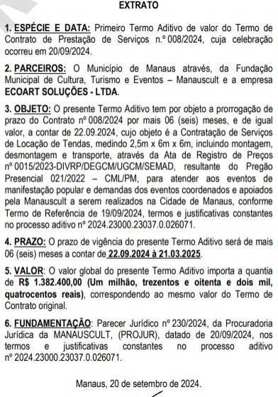 A prefeitura de Manaus, por meio da Fundação Municipal de Cultura, Turismo e Eventos (Manauscult), renovou contratos com as empresas MF Produções, Ecoart e Barra Som, que somam R$ 5 milhões para locação de tendas. Os extratos foram publicados no Diário Oficial do Município (DOM) de terça-feira (8). Na última semana, a pasta já havia renovado contrato com a empresa Unipublicidade para o mesmo tipo de serviço.