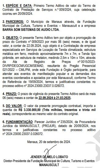 De acordo com os extratos, as empresas MF Produções Artísticas e Eventos Ltda (contrato nº 007/2024); Ecoart Soluções Ltda (contrato nº 008/2024); e Barra Som Sistemas de Audio Ltda (contrato nº 009/2024) tiveram os serviços renovados por mais seis meses.