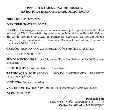 O prefeito Dedei Lobo, de Humaitá, no Amazonas, contratou por R$ 380 mil o show da dupla Matheus e Kauan para a 13ª Exposição Agropecuária, que acontece no dia 23 de setembro de 2022, no município. O contrato de licitação foi publicado no Diário Oficial dos Municípios, nesta terça-feira (30).