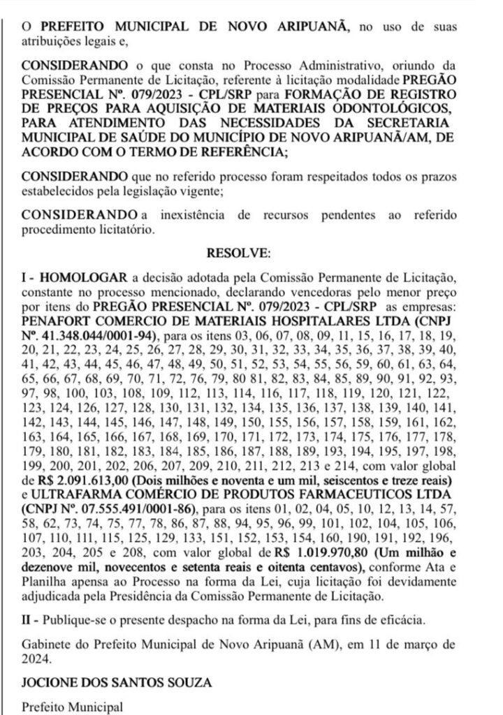 O prefeito de Novo Aripuanã, Jocione dos Santos Souza (PSDB), aprovou uma série de contratos milionários com empresas de diversos setores, pouco mais de um mês antes de deixar o cargo. Esses contratos, que somam mais de R$ 6,5 milhões, foram formalizados após a aprovação de um aumento salarial considerável para o próximo chefe do Executivo municipal, que passará a receber R$ 29,7 mil mensais. As publicações dos contratos ocorreram na última sexta-feira (22), no Diário Oficial dos Municípios do Amazonas.