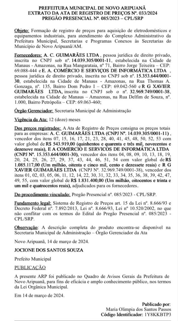 Embora os extratos de registro de preços para esses contratos tenham sido assinados em março de 2024, a publicação dos mesmos no Diário Oficial só aconteceu em novembro, a menos de um mês do término do mandato de Jocione dos Santos Souza.