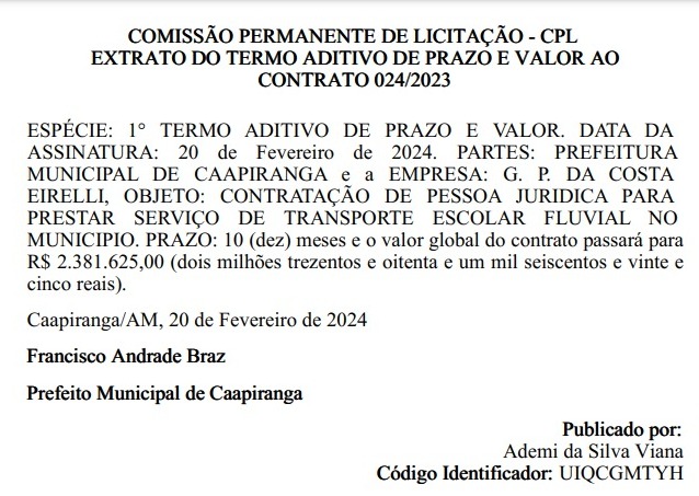 O primeiro extrato é um termo aditivo de um contrato de R$ 2.381.625,00 com a empresa G. P. DA COSTA EIRELLI, a qual presta serviço de transporte escolar fluvial no município.