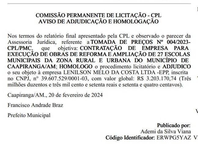 A Prefeitura de Caapiranga (a 134 quilômetros de Manaus) publicou extratos de três contratos avaliados em R$ 8.332.330,74 para prestação de serviços e contratação de uma empresa para construir unidades escolares no município. Os extratos foram assinados pelo prefeito Francisco Andrade Braz, o Tico Braz (União), e publicados no Diário Oficial dessa terça-feira (20).