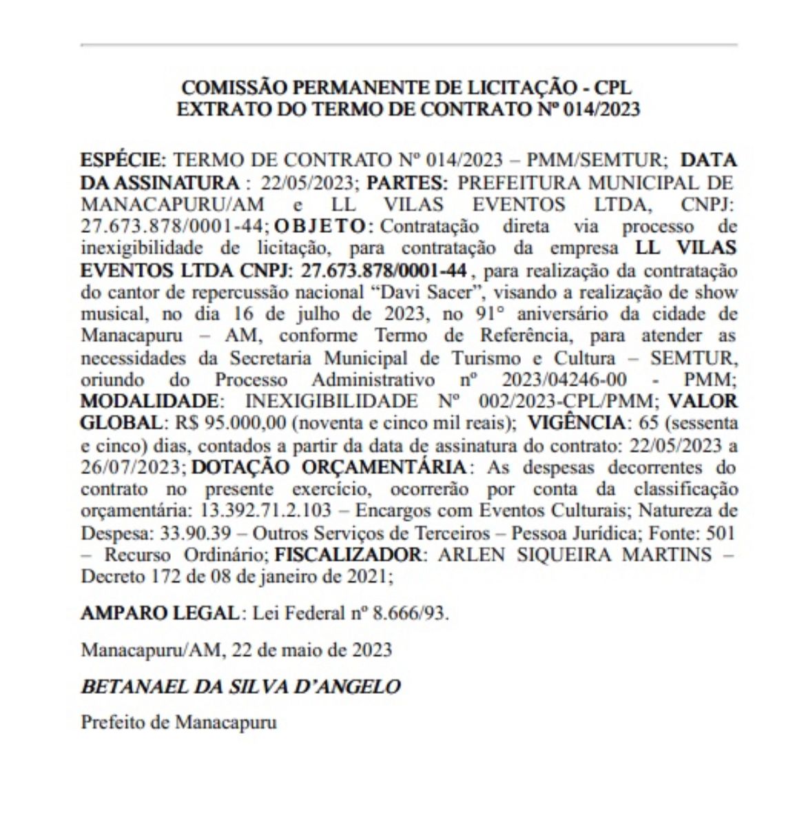 O prefeito de Manacapuru, município do interior do Amazonas, Beto D’Angelo, contratou o show gospel do cantor Davi Sacer por R$ 95 mil e publicou a assinatura nesta terça-feira (30), no Diário Oficial dos Municípios.
