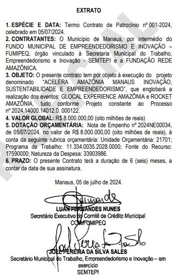 A Prefeitura de Manaus, através do Fundo Municipal de Inclusão Produtiva e Econômica (Fumipeq) da Secretaria Municipal de Trabalho, Empreendedorismo e Inovação (Semtepi), assinou um contrato de patrocínio no valor de R$ 8 milhões com a Fundação Rede Amazônica. O acordo visa a execução do projeto “Acelera Amazônia Manaus: Inovação, Sustentabilidade e Empreendedorismo” ao longo de seis meses. A informação foi publicada no Diário Oficial do Município de Manaus (DOM), nessa quarta-feira (10).