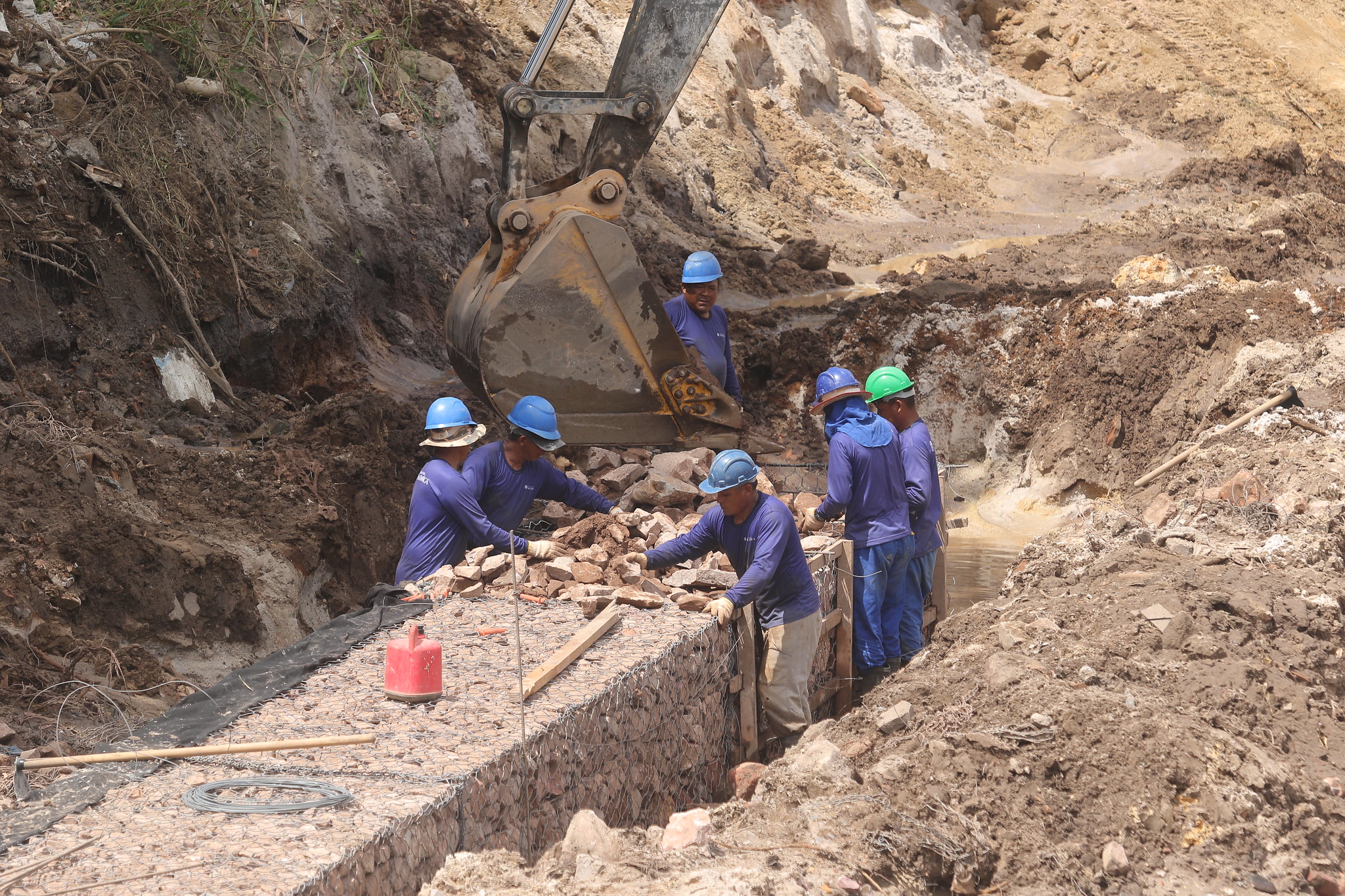 Simultaneamente, estão sendo implantadas duas linhas de 235 metros lineares de rip-rap e gabião, nas laterais do leito do igarapé, com o auxílio de retroescavadeira e uma pá carregadeira. As equipes trabalham, ainda, no alargamento do igarapé, para dar maior vazão às águas do leito do igarapé, de modo a coibir o transbordamento e consequentemente as inundações na área.