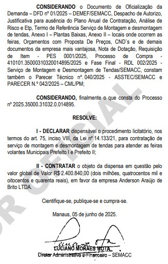 A Prefeitura de Manaus, por meio da Secretaria Municipal de Agricultura, Abastecimento, Centro e Comércio Informal (Semacc), contratou por R$ 2,4 milhões com dispensa de licitação uma empresa cuja atividade principal é “atividades de sonorização e de iluminação” para montar e desmontar tendas das feiras volantes da capital. O contrato foi publicado no Diário Oficial do Município (DOM) nessa sexta-feira (6).