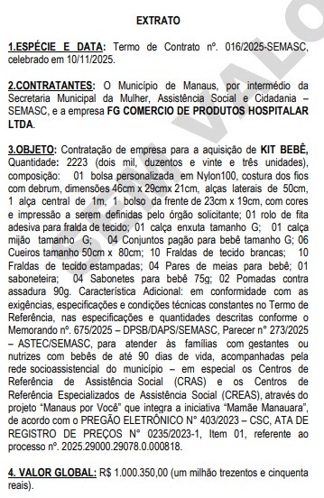 Conforme o contrato, de nº 016/2025-Semasc, foi firmado em 10 de novembro de 2025 e prevê o fornecimento dos kits compostos por diversos itens, entre eles bolsa personalizada, fraldas, toalhas, lençóis, mamadeiras e conjuntos de roupinhas.