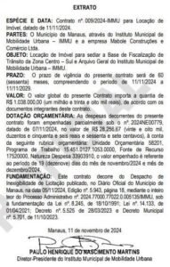 A Prefeitura de Manaus, por meio do Instituto Municipal de Mobilidade Urbana (IMMU), formalizou um contrato com a empresa Mabole Construções e Comércio Ltda, para a locação de um imóvel destinado à sede da base de fiscalização da zona Centro-Sul e arquivo geral. O valor total do contrato, assinado com dispensa de licitação, é de R$ 1.038.000,00 e terá validade por 60 meses.