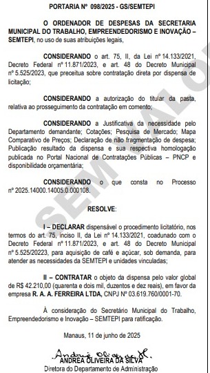 A Prefeitura de Manaus, por meio da Secretaria Municipal do Trabalho, Empreendedorismo e Inovação (Semtepi), dispensou licitação para a compra de café e açúcar. O valor da aquisição totaliza R$ 42.210,00, levando em conta que a quantia que seria suficiente para adquirir mais de meia tonelada dos produtos.