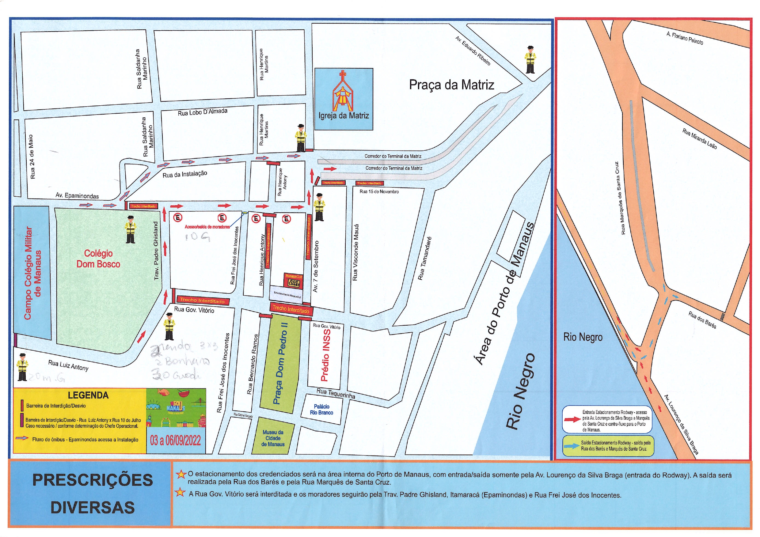 De acordo com o mapa de fluxo, o visitante terá acesso ao festival pelos portais de entrada que ficarão localizados no início da avenida 7 de Setembro e na rua Governador Vitório, que fica em frente à praça Dom Pedro, no centro histórico de Manaus. As vias do entorno, como as ruas Bernardo Ramos e Henrique Antony, serão bloqueadas a partir das 21h desta sexta-feira, 2/9, pelos agentes do Instituto Municipal de Mobilidade Urbana (IMMU). Os moradores do entorno seguirão pela travessa Padre Ghisland, Itamaracá (avenida Epaminondas) e rua Frei José dos Inocentes.
