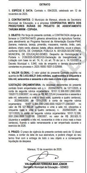 Entre as entidades beneficiadas, o maior montante foi destinado à Cooperativa Mista do Projeto de Assentamento Tarumã-Mirim (Copasa), que recebeu R$ 3,45 milhões, por meio do contrato nº 094/2025. O acordo prevê a entrega de produtos como abóbora, alface, abacaxi, couve, cheiro-verde, batata e pitaya, dentro das regras do Programa Nacional de Alimentação Escolar (PNAE). A contratação ocorreu por inexigibilidade de licitação, conforme prevê a legislação federal e o Decreto Municipal nº 5.940.