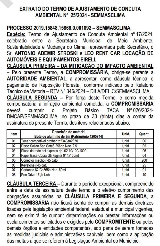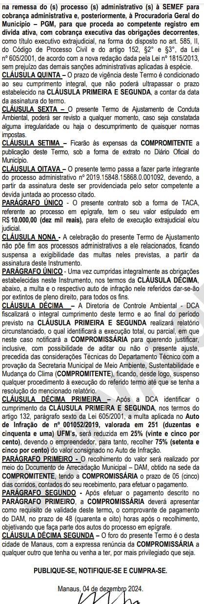 Ainda conforme o termo, a empresa deverá cumprir o Projeto Básico TACA Nº 026/2024, dentro do prazo de 30 dias a contar da assinatura do termo.