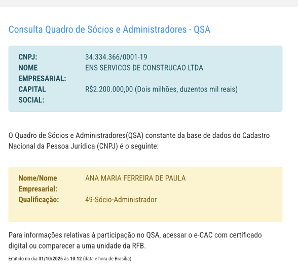 A empresa é administrada por ANA MARIA FERREIRA DE PAULA, com CNPJ: 34.334.366/0001-19 e avaliada em R$2.200.000,00 (Dois milhões, duzentos mil reais).