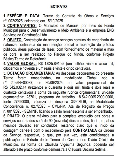 A Prefeitura de Manaus vai desembolsar R$ 1.025.891,25 para serviços de manutenção no Parque Municipal do Mindu, localizado na zona Centro-Sul da cidade. O contrato, assinado no dia 15 de outubro, foi publicado no Diário Oficial do Município (DOM), e prevê apenas 90 dias de execução. A empresa ENS Serviços de Construção Ltda foi contratada pelo Fundo Municipal para o Desenvolvimento do Meio Ambiente (Fmdma) para realizar reparos e manutenção predial, incluindo áreas públicas de lazer, com fornecimento de materiais e mão de obra. Segundo o extrato do contrato, parte do valor — R$ 342 mil — já foi empenhada, e o restante será pago conforme o andamento das obras.