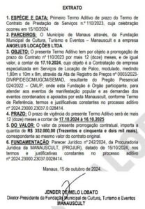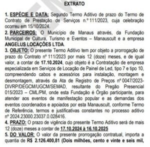 A Prefeitura de Manaus, por meio da Fundação Municipal de Cultura, Turismo e Eventos (Manauscult), prorrogou por mais 12 meses dois contratos com a empresa Angelus Locações Ltda., no valor total de R$ 2,5 milhões. Os contratos, renovados para locação de palco e painéis de LED, foram divulgados na edição do Diário Oficial do Município (DOM), no dia 8 de novembro.