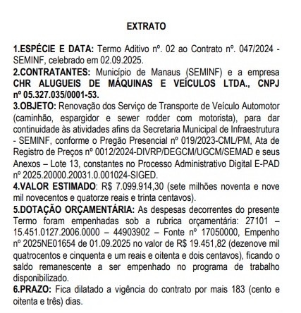 A CHR Aluguéis de Máquinas e Veículos é responsável por fornecer caminhões e maquinários utilizados em serviços de infraestrutura e manutenção urbana da capital. O aditivo amplia a vigência do contrato por mais 183 dias, a contar da data da assinatura.