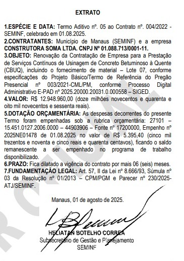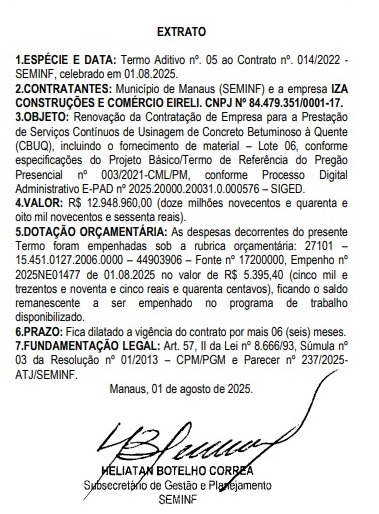 A Prefeitura de Manaus, por meio da Secretaria Municipal de Infraestrutura (Seminf), publicou a renovação de contratos com duas empresas no valor total de R$ 25,8 milhões. É a quinta vez que a pasta chefiada pelo vice-prefeito Renato Junior (Avante) prorroga as contratações com as empresas IZA Construções e Comércio e Construtora Soma por mais seis meses.