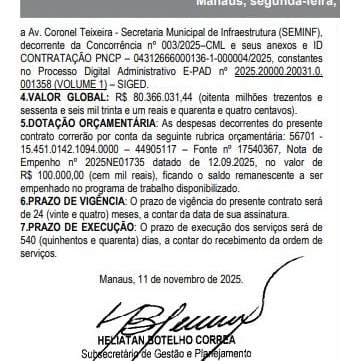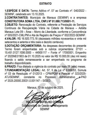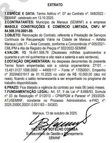 Também foram renovados contratos da Construtora Soma Ltda., no valor de R$ 16,9 milhões, e da Mabole Construções e Comércio Ltda., que recebeu mais R$ 16,4 milhões para continuidade dos serviços no Lote 17, área do Coroado. A Locamix, por sua vez, teve prorrogado o contrato de R$ 8,9 milhões.