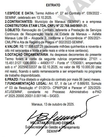 A Prefeitura de Manaus, por meio da Secretaria Municipal de Infraestrutura de Manaus (Seminf), renovou cinco contratos do programa Asfalta Manaus, somando R$ 140,2 milhões, por mais seis meses. As empresas contempladas são Locamix Serviços de Locação e Construção Ltda. (R$ 8,9 milhões), Construtora Etam Ltda. (R$ 17,6 milhões e R$ 80,4 milhões), Construtora Soma Ltda. (R$ 16,9 milhões) e Mabole Construções e Comércio Ltda. (R$ 16,4 milhões), conforme publicação no Diário Municipal de Manaus (DOM) Manaus, dessa segunda-feira (17).