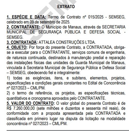 A Prefeitura de Manaus, por meio da Secretaria Municipal de Segurança Pública e Defesa Social (Semseg), contratou uma empresa por R$ 7,2 milhões para manutenção predial e reparação das unidades físicas das unidades da Guarda Municipal de Manaus (GMM). A Attalea Construções Ltda., que venceu a concorrência, também presta serviços à Secretaria Municipal de Infraestrutura (Seminf), onde já recebeu R$ 14,5 milhões.