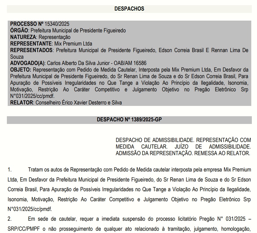 A Prefeitura de Presidente Figueiredo, comandada por Fernando Vieira (PL), passou a ser alvo de uma nova denúncia no Tribunal de Contas do Estado do Amazonas (TCE-AM). A Corte acatou a representação com pedido de medida cautelar, para investigar possíveis irregularidades em um processo licitatório do município. A ação, registrada no Diário Eletrônico do TCE-AM, foi apresentada pela empresa Mix Premium Ltda e envolve os servidores Renan Lima de Souza e Edson Correia Brasil.