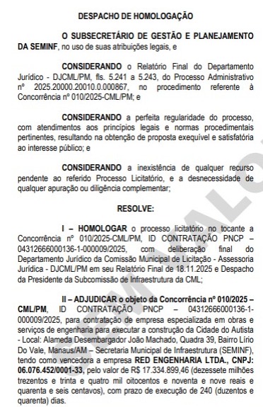 De acordo com o despacho de homologação assinado pela Subsecretaria de Gestão e Planejamento da Secretaria Municipal de Infraestrutura (Seminf), o processo foi considerado regular após análise jurídica e técnica, resultando na adjudicação do objeto à empresa selecionada. O documento aponta que não houve recursos pendentes e que as etapas da concorrência atenderam aos requisitos legais.
