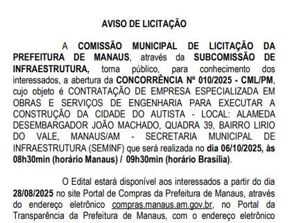 A publicação do aviso da licitação consta no Diário Oficial de Manaus dessa terça-feira, dia 26, edição 6141.