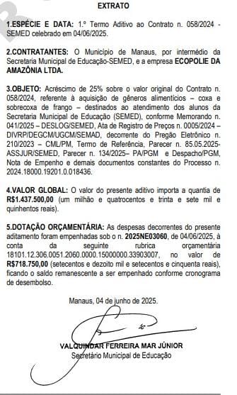 Os contratos foram firmados com a empresa Ecopolie da Amazônia Ltda de propriedade de Vitor Ciarlini Rabelo. O primeiro foi uma renovação para fornecimento de coxa e sobrecoxa de frango destinados ao atendimento de alunos da Secretaria Municipal de Educação (Semed). Além disso, houve um acréscimo de 25% sobre o valor original do contrato, que agora é de R$ 1,4 milhão.