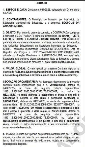 Já o novo contrato firmado com a empresa é para fornecer leite em pó integral e carne bovina tipo músculo “para atender com merenda escolar os alunos devidamente matriculados nas unidades educacionais” da Semed. O valor global no extrato foi de mais de R$ 15,5 milhões. Juntos, ambos chegam a mais de R$ 17 milhões. O prazo de fornecimento é de doze meses.