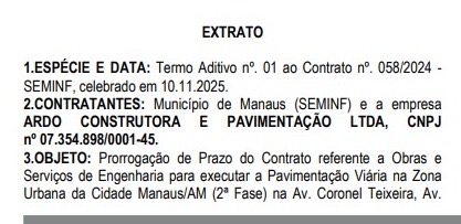 Conforme o extrato publicado no DOM, o contrato da Ardo, de nº 058/2024, foi prorrogado para a continuidade de obras e serviços de pavimentação viária em diferentes trechos da zona urbana de Manaus, incluindo as avenidas Coronel Teixeira, Paraíba e áreas dos conjuntos Alphaville 1 e 2.