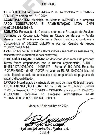Essa não foi a única renovação envolvendo a Ardo nesta quinzena. Na semana passada, a empresa já havia sido beneficiada com outro aditivo de R$ 14,7 milhões, publicado no DOM da última segunda-feira (3). Esse contrato, renovado por mais seis meses, refere-se aos serviços contínuos de recuperação viária do Asfalta Manaus.