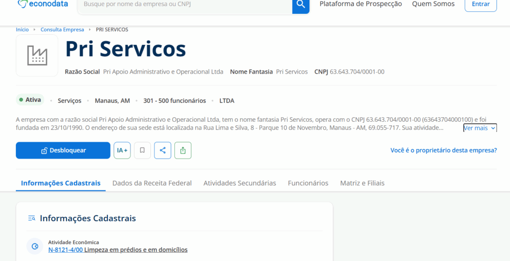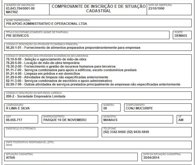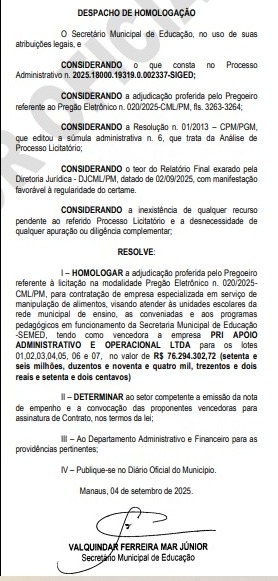 A Prefeitura de Manaus homologou o resultado de um pregão eletrônico de R$ 76,2 milhões que teve como vencedora a empresa Pri Serviços para prestar serviços de manipulação de alimentos nas unidades escolares da rede municipal de ensino, conveniadas e programas pedagógicos geridos pela Secretaria Municipal de Educação (Semed). Embora atualmente tenha como atividade principal o fornecimento de alimentos preparados preponderadamente para empresas, outros sites de consultas a CNPJ mostram que, originalmente, a atividade principal da Pri Serviços era a limpeza em prédios e domicílios.