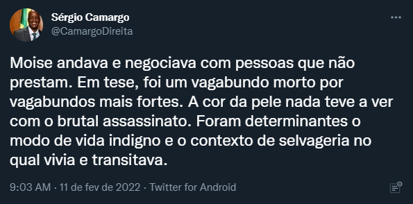O bolsonarista Sérgio Camargo, presidente da Fundação Palmares, provocou revolta nas redes sociais ao chamar o congolês Moïse Kabamgabe de “vagabundo” e insinuar que ele seria envolvido em atividades criminosas, sem apresentar prova alguma de suas afirmações. O imigrante foi brutalmente espancado após cobrar diárias de um quiosque no qual trabalhou na Barra da Tijuca, Rio de Janeiro.