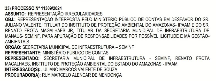 Uma recomendação oferecida pelo Ministério Público de Contas (MPC-AM), que apura possível ilicitude e má gestão praticada pelo titular da Secretaria Municipal de Infraestrutura (Seminf), Renato Júnior, e o então titular do Instituto de Proteção Ambiental do Amazonas (Ipaam), Juliano Valente, está em pauta no Tribunal de Contas do Amazonas (TCE-AM) pelo conselheiro Mario Manoel de Mello. A informação consta no Diário Oficial do TCE-AM do dia 28 de fevereiro.