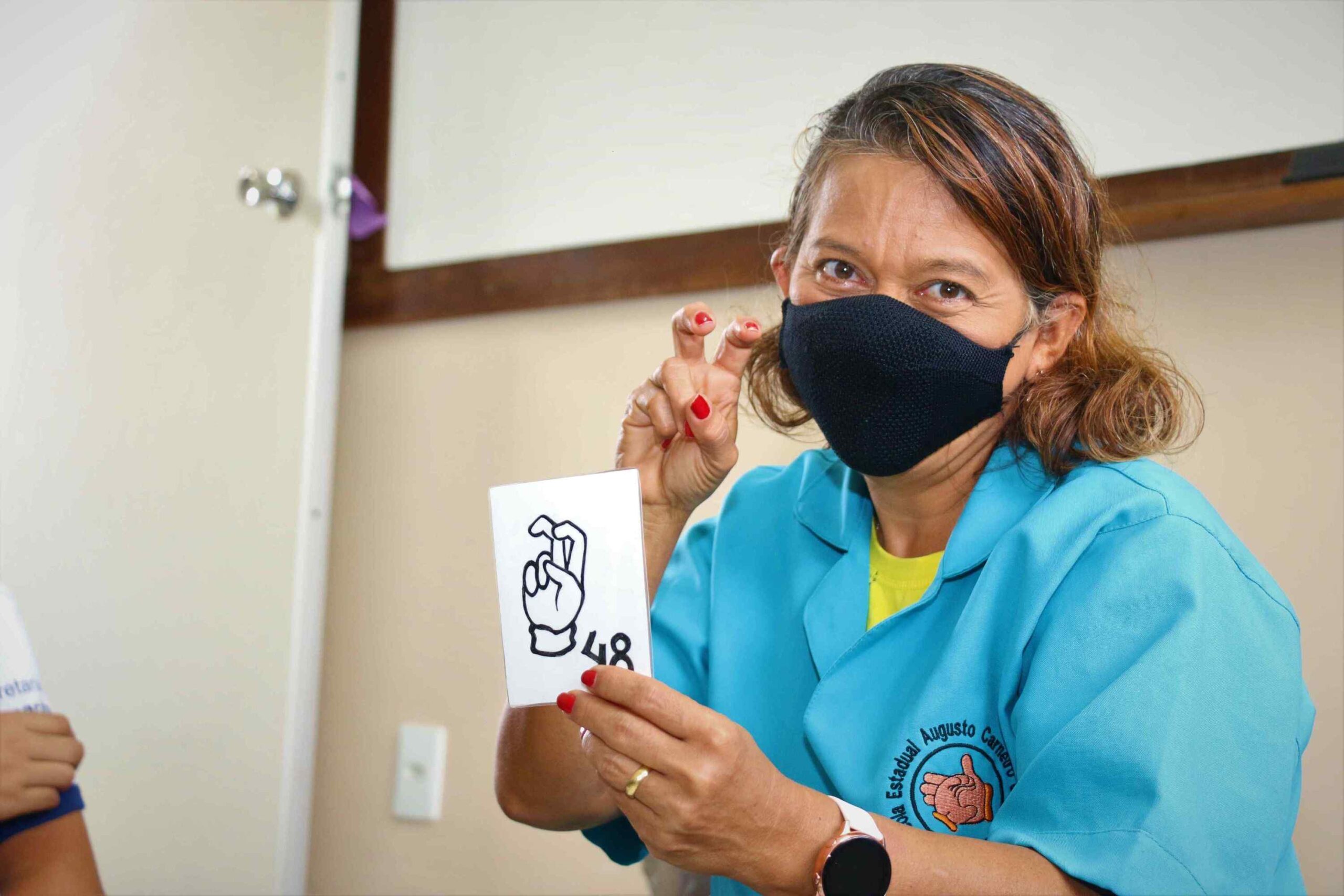 “Fiquei muito emocionada, eu me vi nessas crianças, então decidi estimulá-las e auxiliá-las. Passei a falar sobre a importância do conhecimento, busquei métodos e estratégias para usar com eles, adequei itens para que todos pudessem entender a importância das Libras para o futuro de cada criança que passa por essa escola”, explica Joelma Sanches.