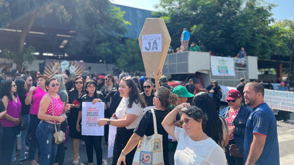A categoria critica, principalmente, a proposta que eleva a idade mínima para aposentadoria. Durante o ato, manifestantes exibiram faixas e cartazes pedindo o arquivamento do projeto. Antes da sessão plenária, sindicatos transmitiram uma live com críticas à proposta e alertas aos vereadores.