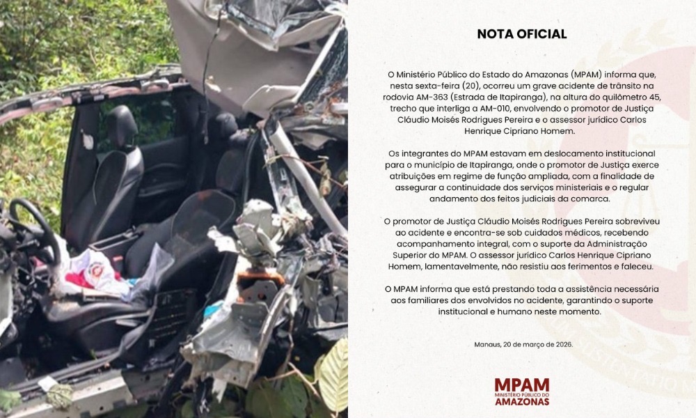 Um grave acidente de trânsito ocorrido na manhã desta sexta-feira, 20, deixou um morto e um ferido na rodovia AM-363, conhecida como Estrada de Itapiranga (a 227 quilômetros de Manaus), no interior do Amazonas. De acordo com informações do Ministério Público do Amazonas (MP-AM), o promotor de Justiça Cláudio Moisés Rodrigues Pereira ficou gravemente ferido, enquanto o assessor jurídico Carlos Henrique Cipriano Homem não resistiu aos ferimentos e morreu no local.