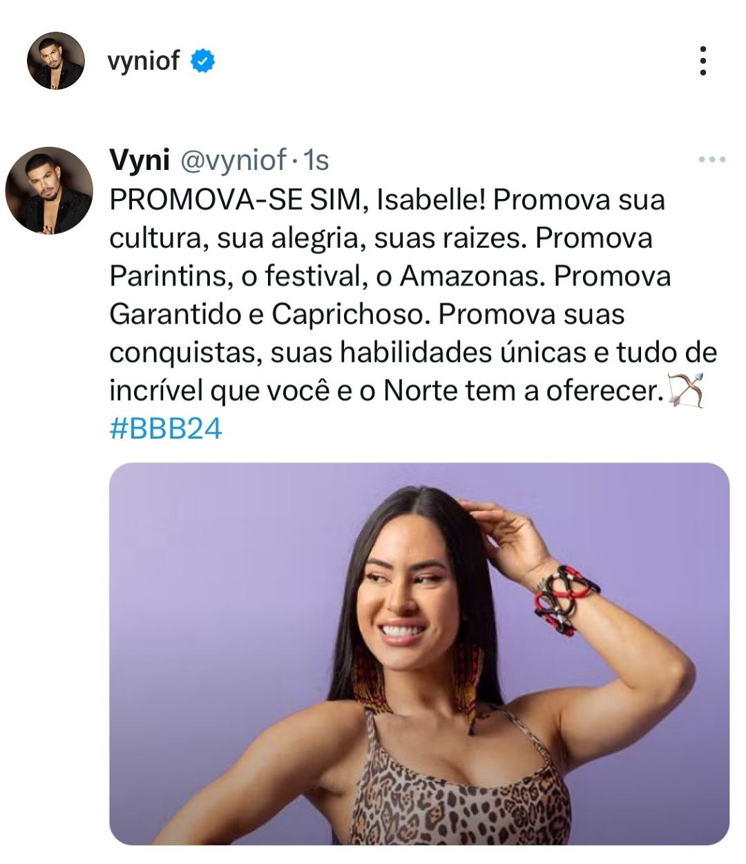 O ex-BBB Vyni, usou as redes sociais nesse sábado (13), para prestar apoio à cunhã-poranga do Boi Garantido, Isabelle Nogueira, que está participando de 24ª edição do Big Brother Brasil (BBB 24), após a mesma ter sido criticada dentro da casa do reality show por querer “se promover” no programa.