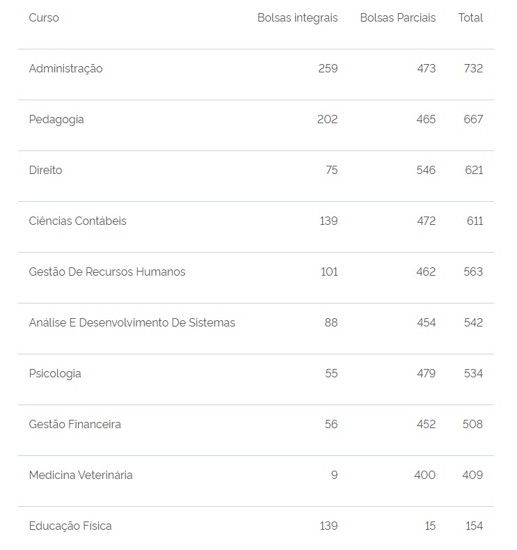 O curso de graduação com o maior quantitativo de bolsas ofertadas no estado é Administração com 732 bolsas, sendo 259 integrais e 473 parciais. Depois dele, os dois cursos com as maiores ofertas são: Pedagogia, com 667 bolsas (202 integrais e 465 parciais), e Direito, com 621 bolsas (75 integrais e 546 parciais).