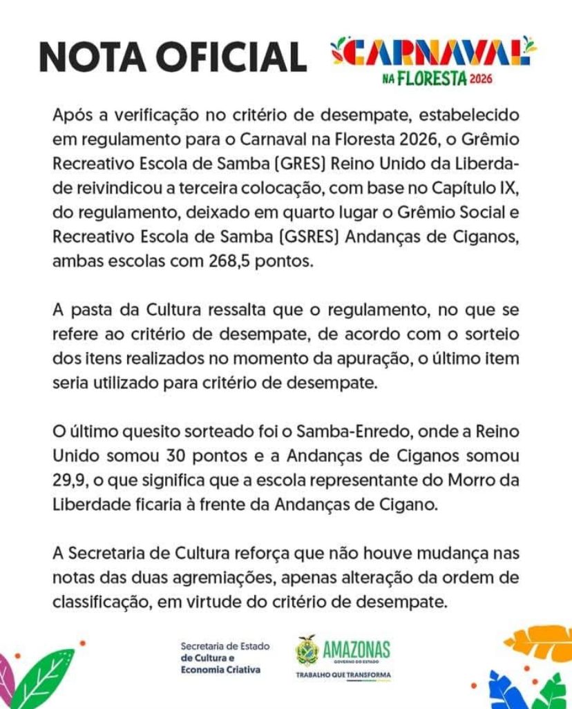 O Carnaval de Manaus teve uma reviravolta na noite desta terça-feira, 17, após a Secretaria de Estado de Cultura e Economia Criativa do Amazonas anunciar a revisão da classificação final do Grupo Especial referente aos desfiles realizados no último sábado, 14 de fevereiro. A mudança ocorreu após a aplicação do critério de desempate previsto em regulamento. Com a decisão, a escola de samba Reino Unido da Liberdade reassumiu o terceiro lugar, enquanto a Andanças de Ciganos passou a ocupar a quarta colocação.