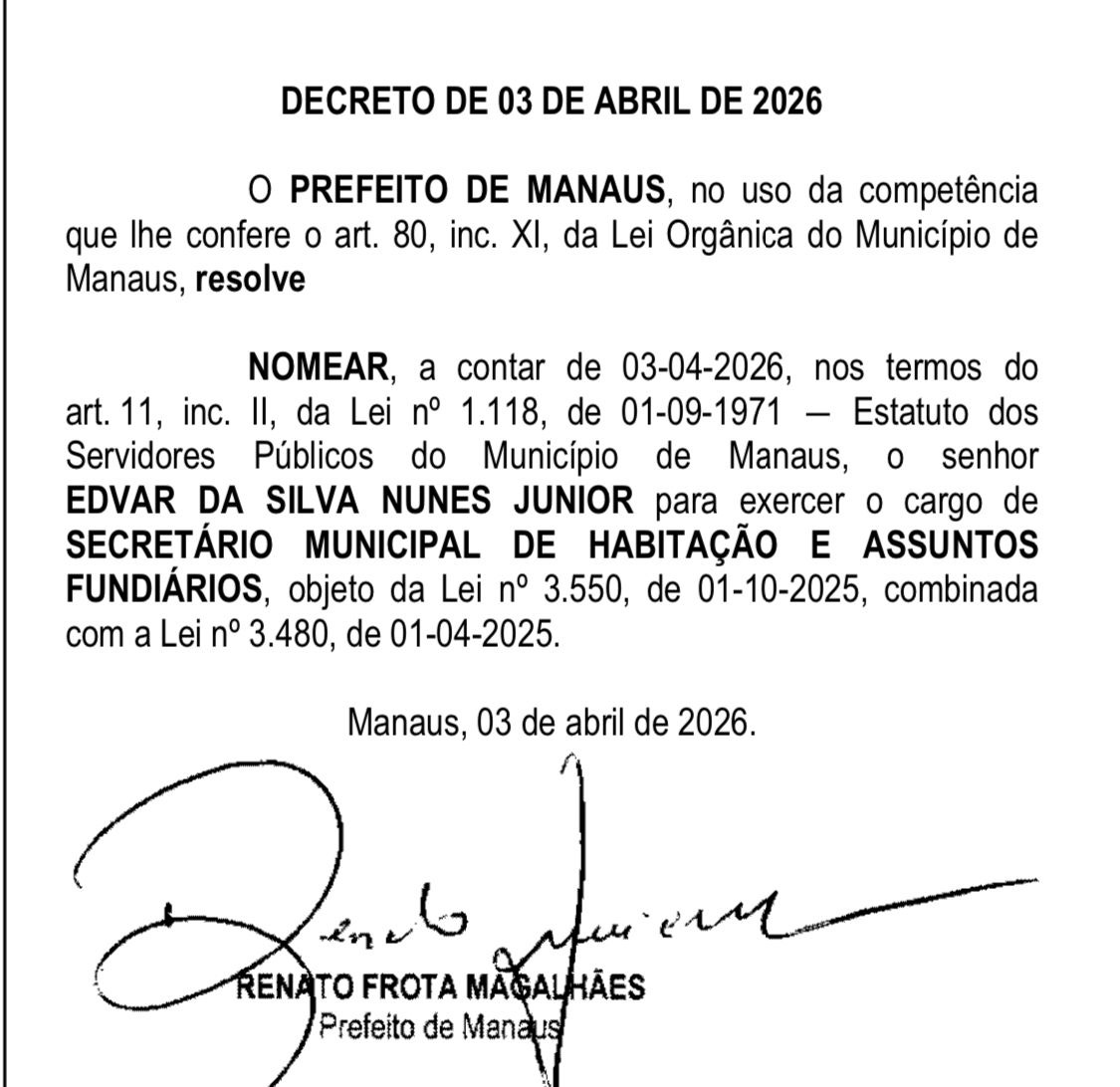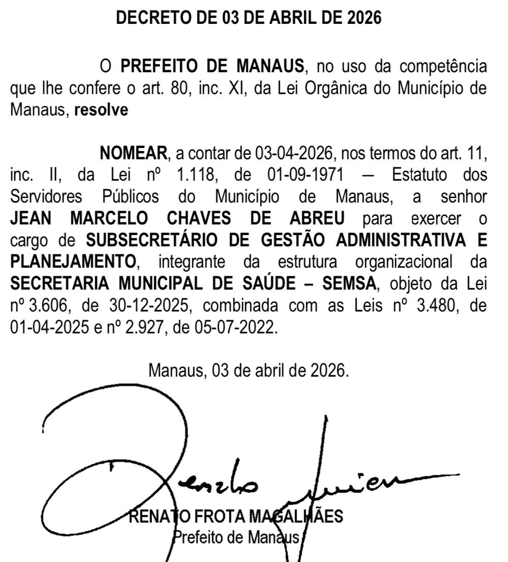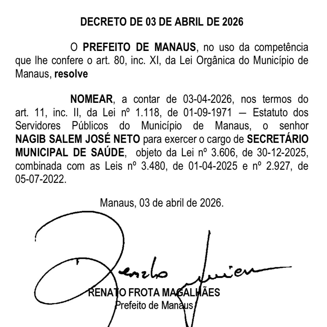 O prefeito de Manaus, Renato Junior (Avante), oficializou nessa sexta-feira, 03, mudanças no primeiro escalão da gestão municipal, com a nomeação de Nagib Salem para a Secretaria Municipal de Saúde (Semsa), Junior Nunes para a Secretaria de Habitação e Assuntos Fundiários (Semhaf) e Márcio Braz Santana para a presidência da Manauscult. As alterações, publicadas em edição extra do Diário Oficial do Município, ocorrem em meio ao período de desincompatibilização para as eleições deste ano.