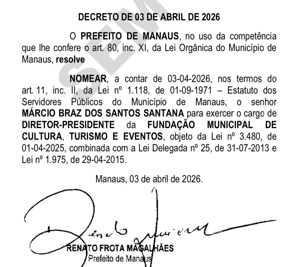 Na Manauscult, Jender Lobato foi exonerado do cargo de diretor-presidente e Márcio Braz Santana deixa de ser diretor de Turismo para assumir como diretor-presidente da fundação. Márcio Braz possui 43 anos, é bacharel em Ciências Sociais pela Ufam, especialista em Gestão e Políticas Culturais pela cátedra Unesco de Políticas Culturais, em colaboração com a Universidade de Girona e o Instituto Itaú Cultural, e Mestre em Ciências Humanas com ênfase em Teoria, História e Crítica da Cultura pela Universidade do Estado do Amazonas (UEA). Atua ainda como artista da cena, produtor e gestor cultural.