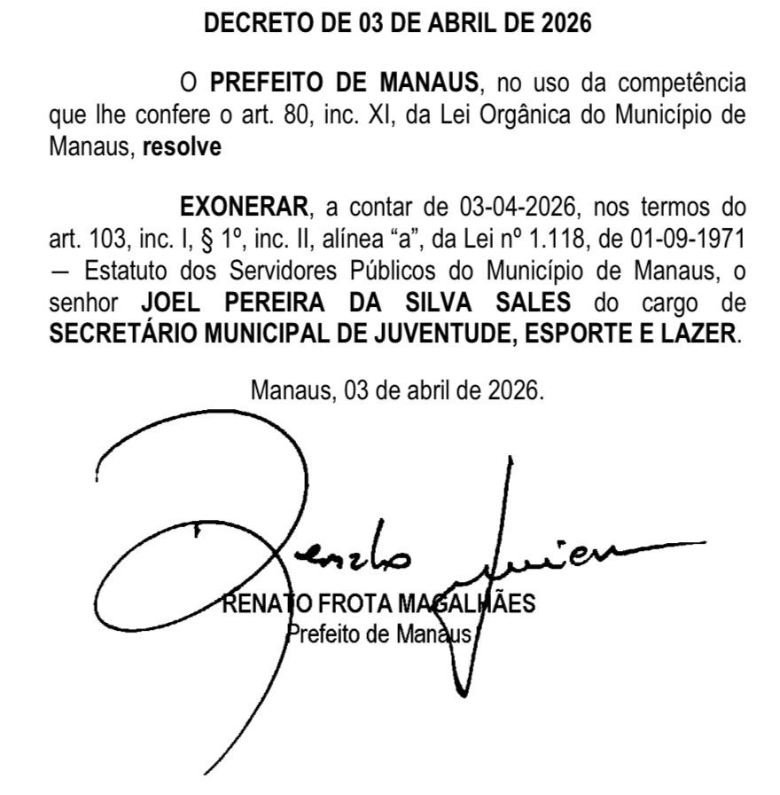 A edição-extra do DOM também confirmou as saídas de Joel Silva do comando da Secretaria Municipal de Juventude, Esporte e Lazer (Semjel) e Robson Goiabeira da Superintendência da Unidade Gestora de Abastecimento de Água e Esgotamento Sanitário (UGPM-Água).
