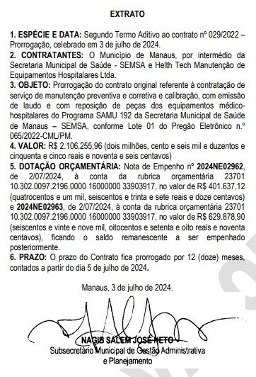 Além disso, é pontuado que o endereço informado como sede comercial da Helth Tech, existe uma sala abandonada, sem haver qualquer vestígio de atividade, indicando assim a falta de capacidade operacional da empresa. Outro ponto é a prorrogação de prazo ocorrer às vésperas das eleições municipais, onde o atual prefeito, David Almeida (Avante), é candidato à reeleição.