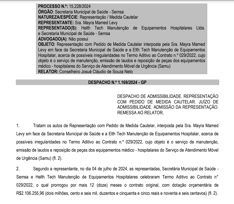O pedido de medida cautelar foi interposta por Mayra Mamed Levy contra a Semsa e a empresa Helth Tech Manutenção de Equipamentos Hospitalares Ltda sobre possíveis irregularidades na renovação do contrato nº. 029/2022, cujo objeto é o serviço de manutenção, emissão de laudos e reposição de peças dos equipamentos médico-hospitalares do Serviço de Atendimento Móvel de Urgência (Samu).