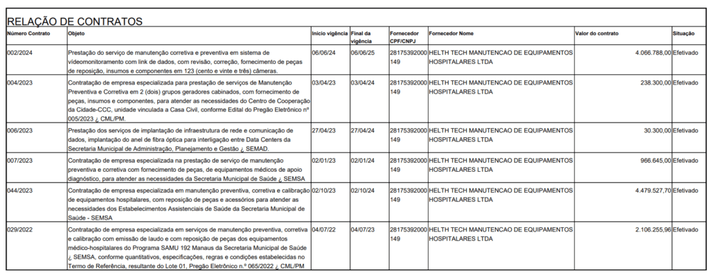 Segundo dados do Portal da Transparência, a empresa Helth Tech já recebeu cerca de R$ 4 milhões de reais e possui diversos contratos com a gestão de David Almeida. Entre os serviços oferecidos estão manutenção de sistema de videomonitoramento, manutenção de geradores, implantação de rede e comunicação de dados e manutenção de equipamentos do Samu.
